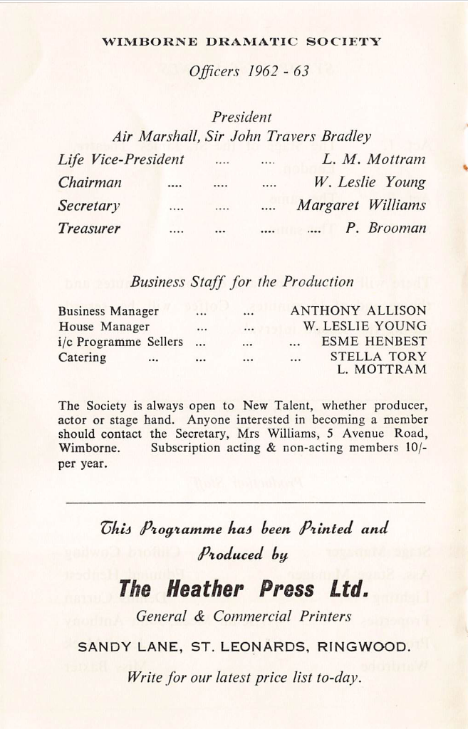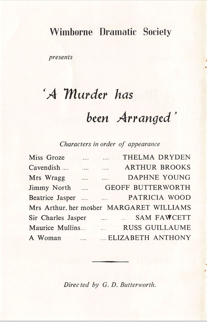 1962 Church House Clifford Cowling Daphne Young (Anderson) Dennis Curran Edmund Henbest Elizabeth Anthony Geoff Butterworth Jenni Meek Joe (Arthur) Brooks John Anthony Margaret Williams Miss Baxtor Past Productions Patricia Wood Russ (Alan) Guillaume Sam Fawcett Thelma Dryden Thriller Wimborne Drama Club