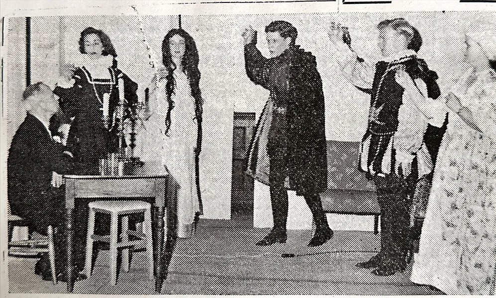 Back stage were : Clifford Cowling, Edmund Henbest, Dennis Curran, Jenni Meek, John Anthony and Miss Baxter.