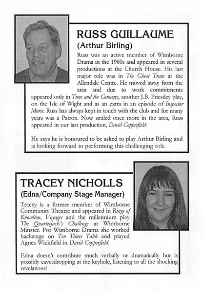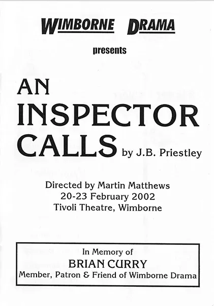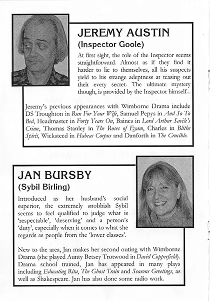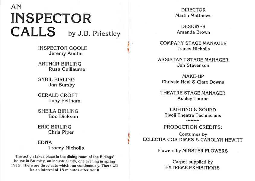 The production marks the directorial debut of Martin Matthews and stars Jeremy Austin as Inspector Goole and Russ Guillaume as Arthur Birling. Also featured are Jan Bursby, Tony Feltham, Boo Dickson, Chris Piper and tracey Nicholls.