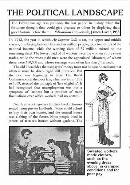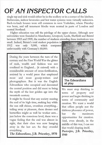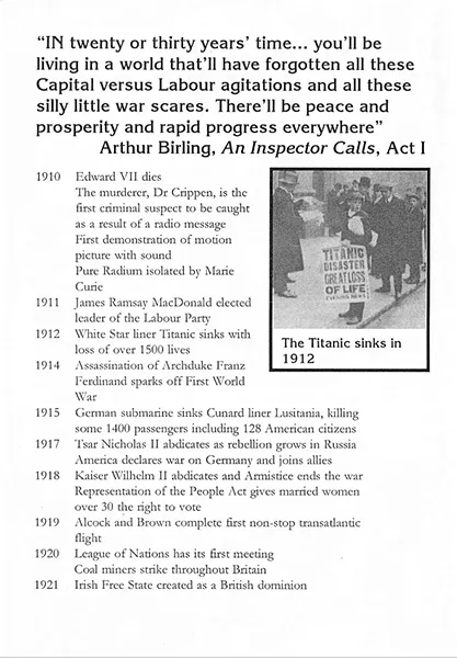 Priestley wrote An Inspector Calls in the last weeks of the second world war. He set the piece in 1912, and by pitching the Edwardian mindset of a comfortable middle class family against the brave new post war vision of the mysterious Inspector Goole, Priestley challenges us all to think about our role and responsibility in society, and to show care and compassion to the needy.