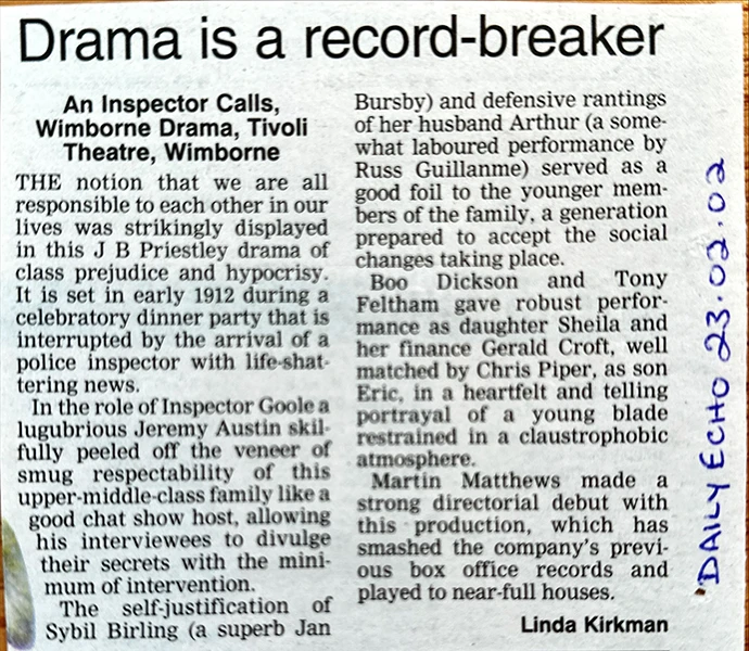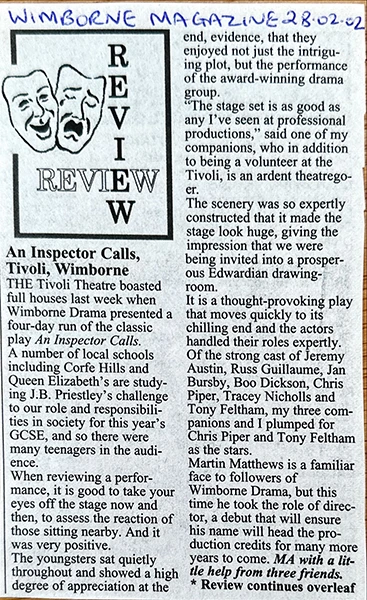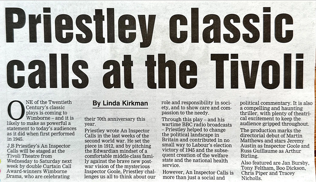 The Tivoli Theatre boasted full houses last week when Wimborne Drama presented a four-day run of the classic play An Inspector Calls. A number of local schools including Corfe Hills and Queen Elizabeth’s are studying J.B. Priestley’s challenge to our role and responsibilities in society for this year’s GCSE, and so there were many teenagers in the audience.
