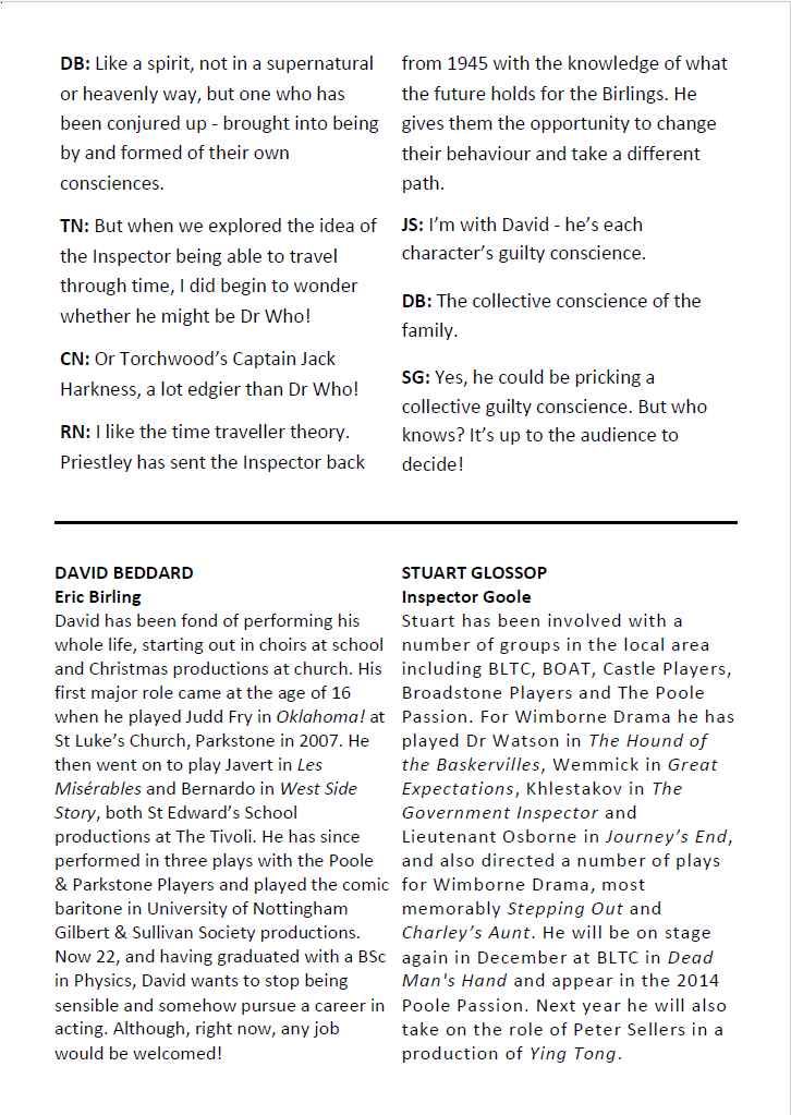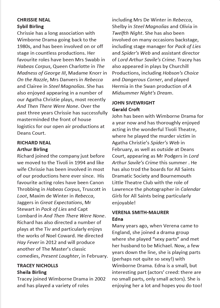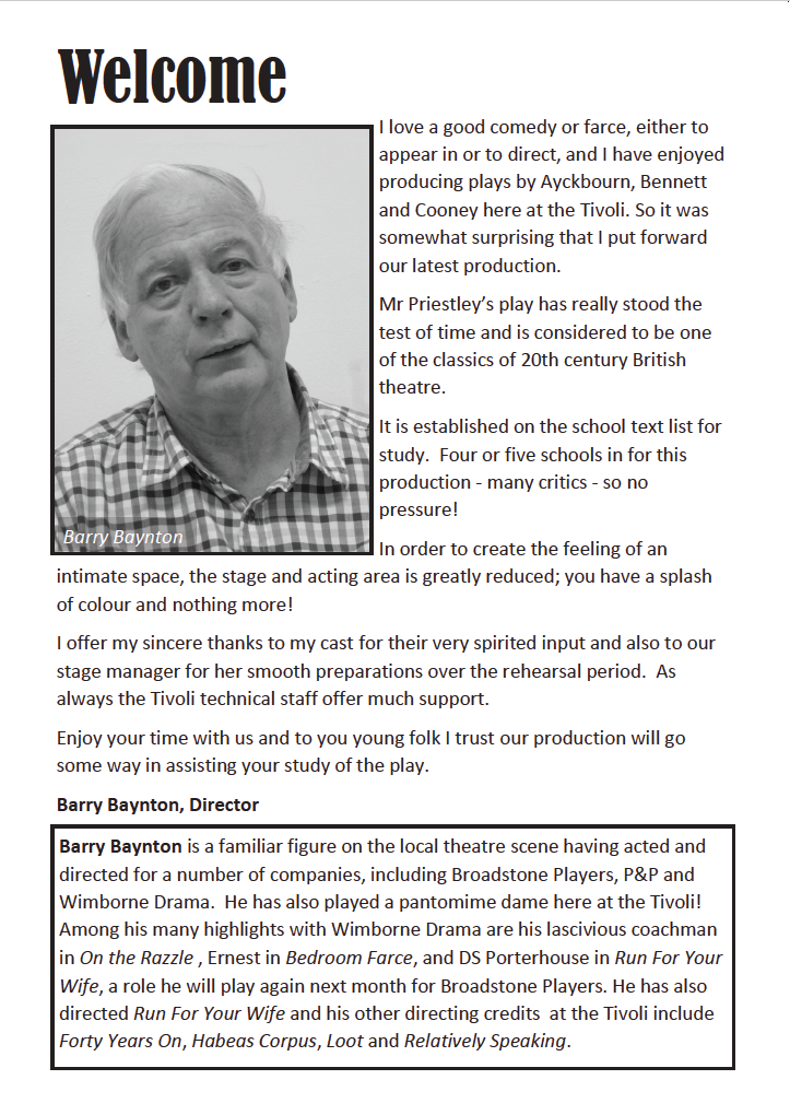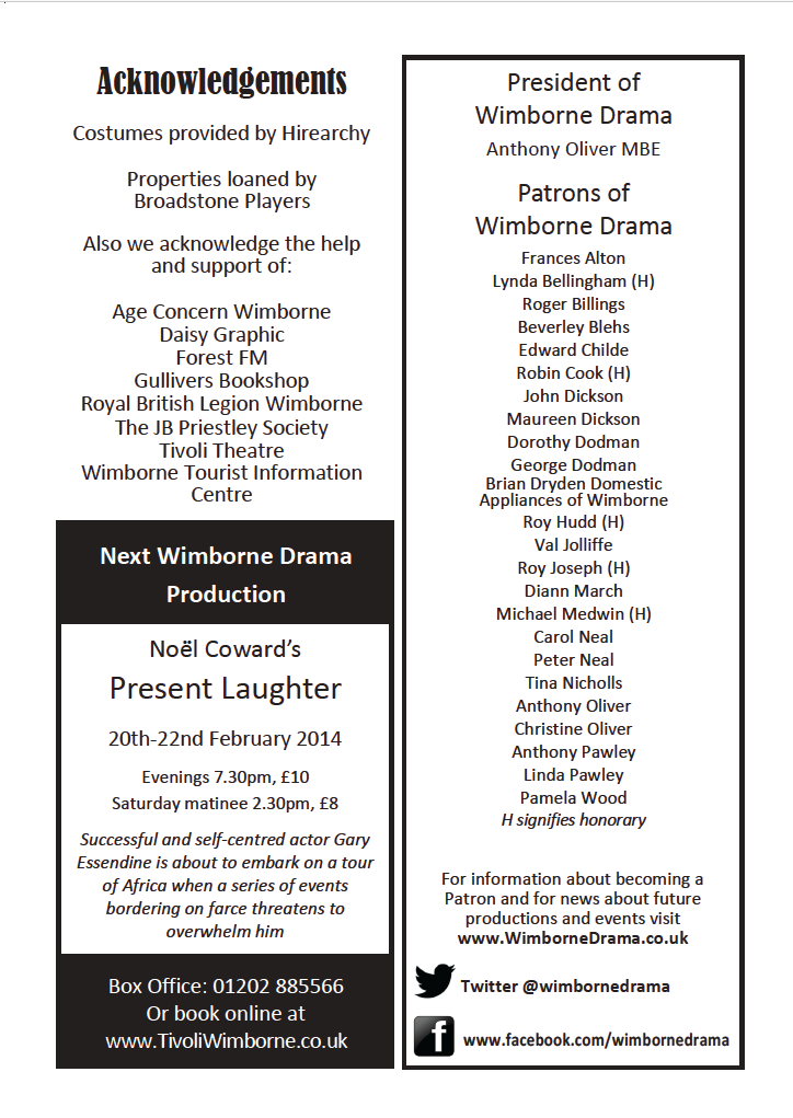 All credit to Barry Baynton for choosing such a challenging play which poses questions about values, integrity, honesty and self-satisfaction which are as relevant today as when the drama was set, prior to World War 1. It is too late now to wonder at the identity of the mysterious Inspector but you can see Wimborne Drama’s next production Present Laughter next February. Don’t miss it.
