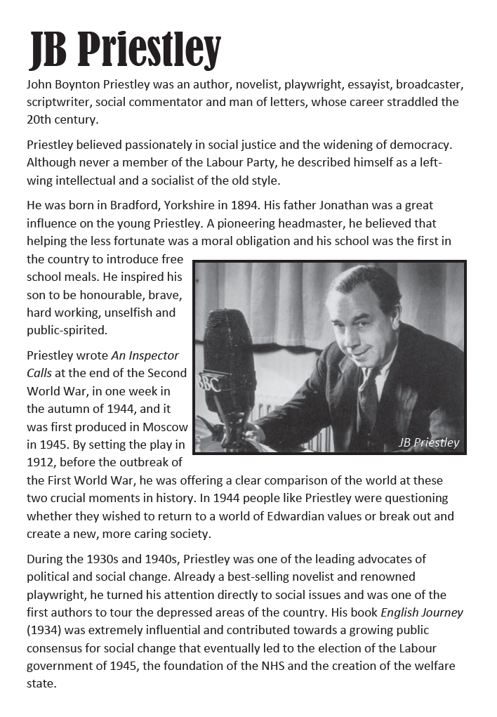 An Inspector Calls by J B Priestley, is a play that revolves around the apparent suicide of a young woman called Eva Smith.