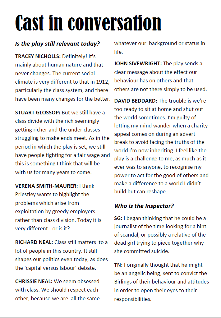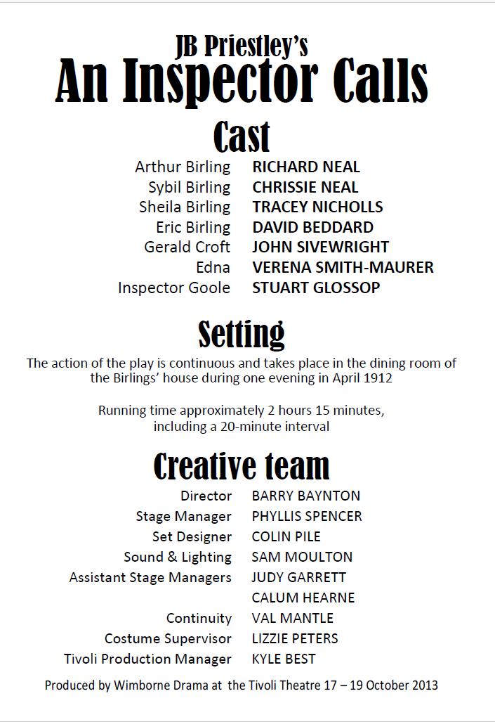 THIS play, by Wimborne Drama, is about an upper-crust English family whose dinner is interrupted by a police inspector who brings news that a girl known to everyone present has dies in suspicious circumstances. It seems any or all could have a hand in her death. But who is the mysterious inspector and what can he want of them?