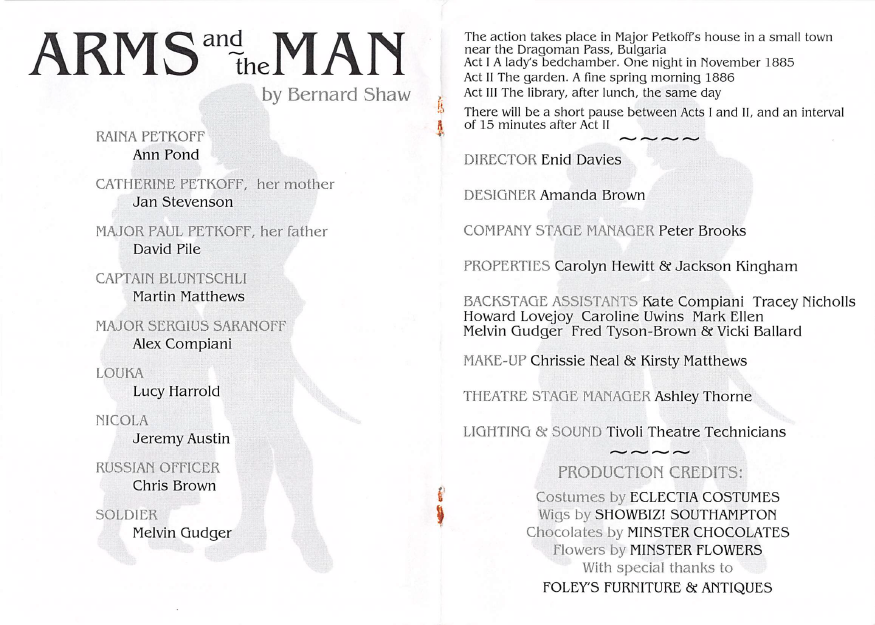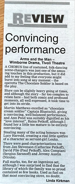 Stealing many of the acting honours was Lucy Harrold, creating a real little spitfire of a character as servant-girl Louka. There were good characterisations too from Jan Stevenson (Catherine Petkoff), David Pile (Paul Petkoff), Alex Compiani (Sergius Saranoff) and Jeremy Austin (Nicola).