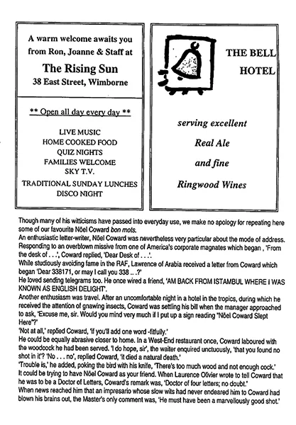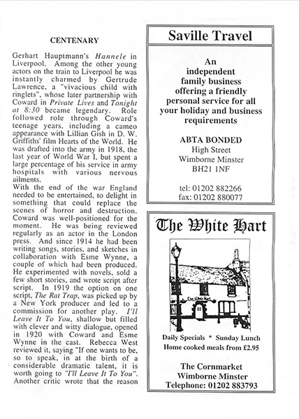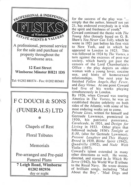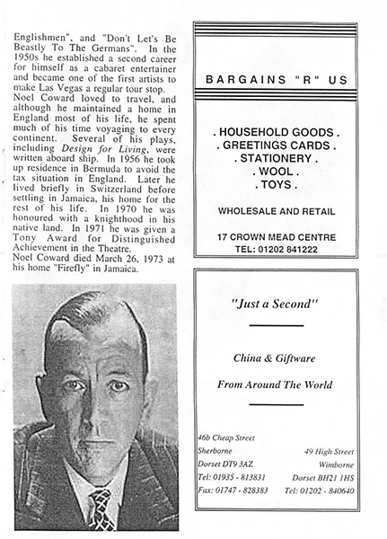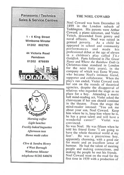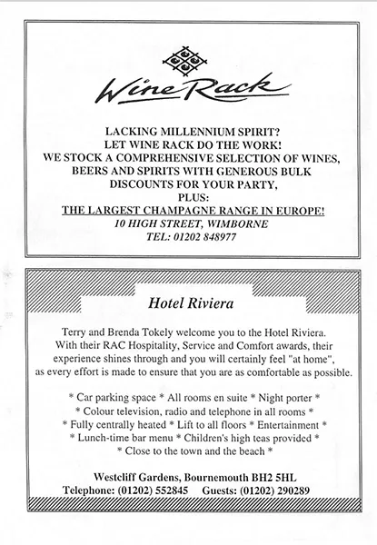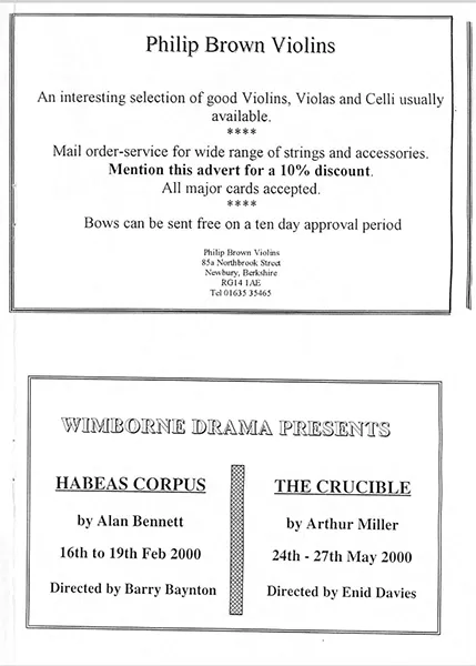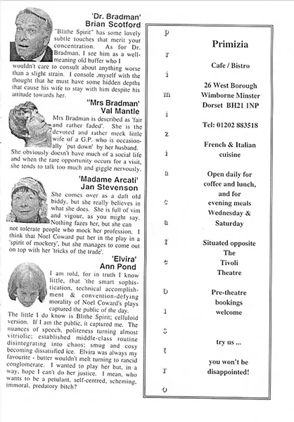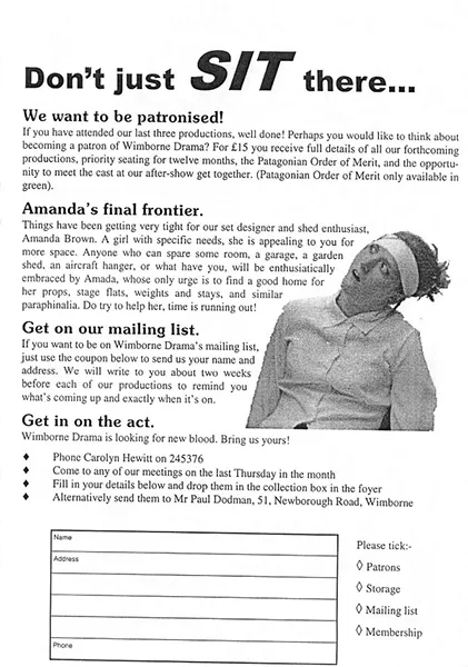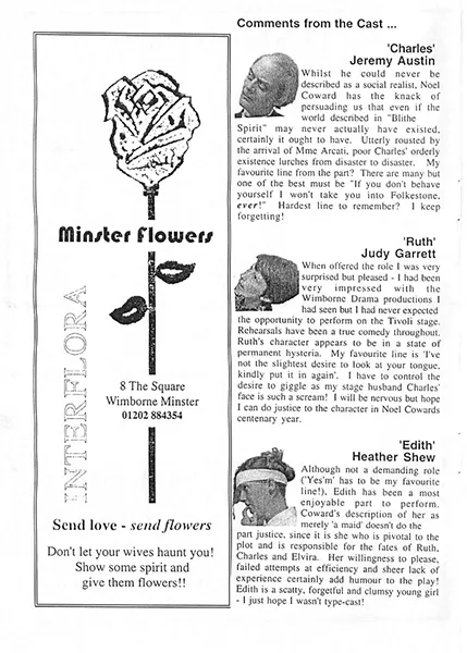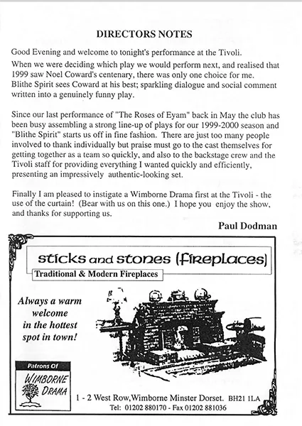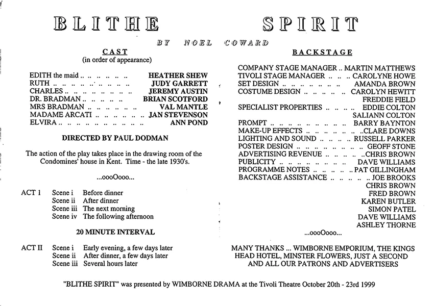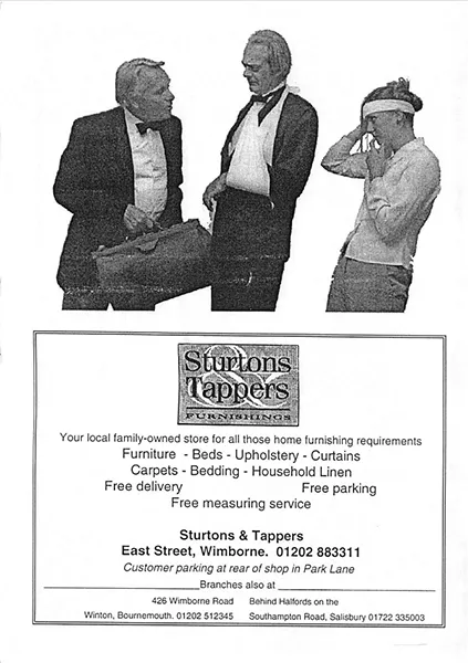 1999 Amanda Brown Ann Pond Ashley Thorne Barry Baynton Brian Scotford Carolyn Hewitt (Woodward)(Young) Carolyne Howe Chris Brown Clare Downs Comedy Dave Williams Eddie Colton Fred Tyson-Brown Freddie Field Geoff Stone Heather Shew Jan Stevenson Jeremy Austin Joe (Arthur) Brooks Judy Garrett Karen Butler Martin Matthews Past Productions Pat Gillingham Paul Dodman Russell Parker Saliann Colton Simon Patel Tivoli Theatre Val Mantle Wimborne Drama