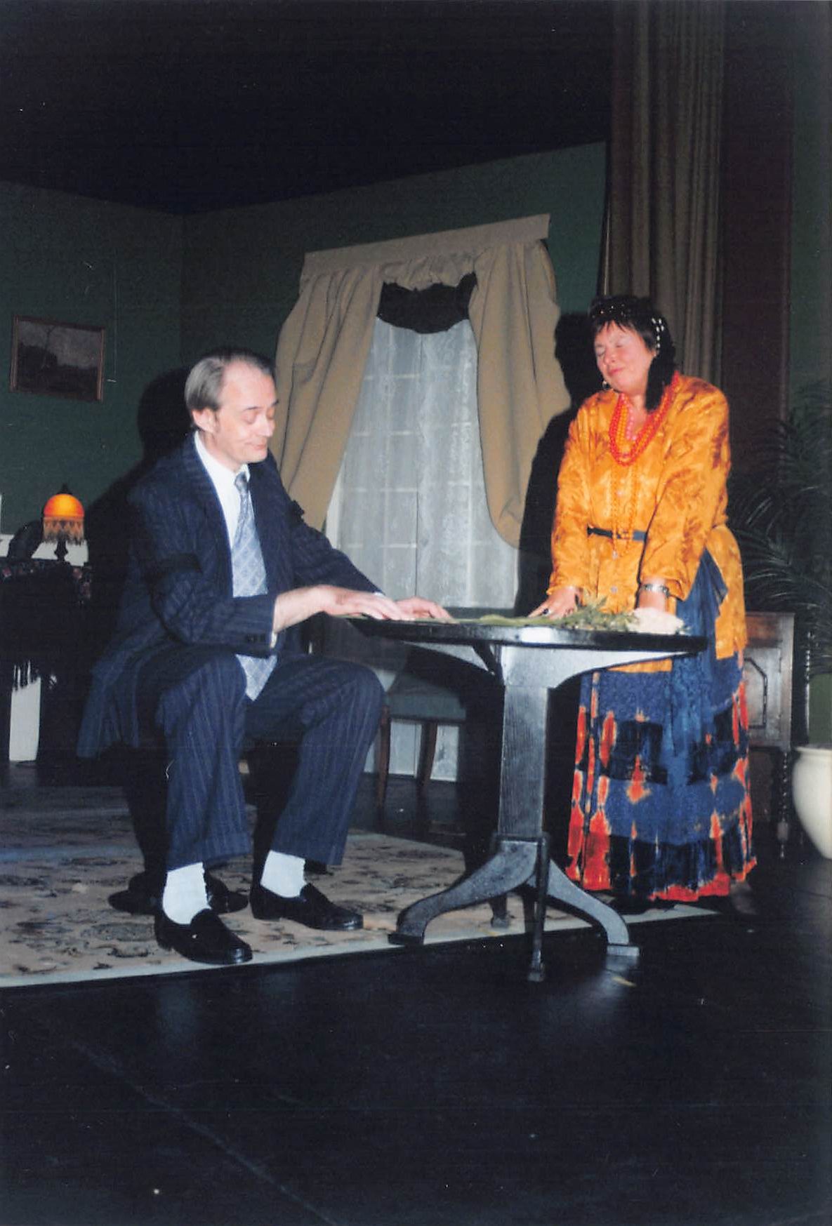 Happily on the whole, Wimborne Drama did justice to this exquisite play, and the spirit of the author shone through as Jan Stevenson as a hale and hearty Madama Arcati, conjures up Elvira (Ann Pond) the dead wife of Charles Condomine (Jeremy Austin) much to the chagrin of his present and very much alive second wife, Ruth (Judy Garrett) causing a catalogue of trauma for the poor bemused man.