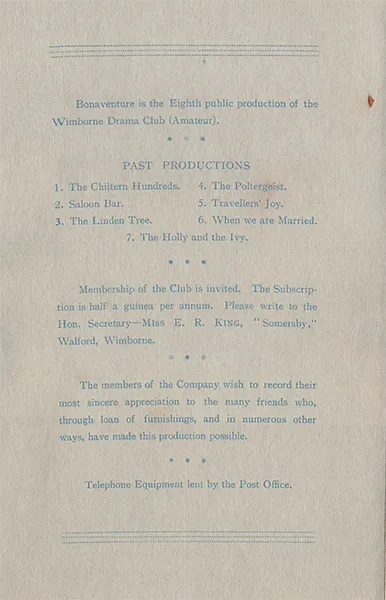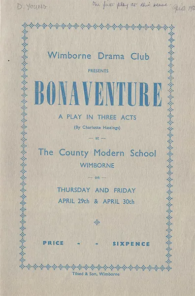 Wimborne Drama Club, well-known for 20 years for the high quality of entertainment it provides, added yet another triumph to its already long list of successed by presenting a very fine performance last week of Charlote Hastings play Bonaventure.