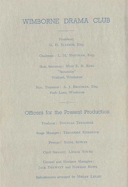 Through the kindness of the headmaster (Mr D. D. Whitmore) and the governors, the magnificent hall and stage in Wimborne County Modern School was available to the the club and for the first time the players had a stage worthy of their efforts and Mr Douglas Treharne, the producer, had lighting and equipment reaching professional standards. By making full use of all the facilities available and backed by a highly-talented and enthusiastic cast, Mr Treharne’s production was faultless.