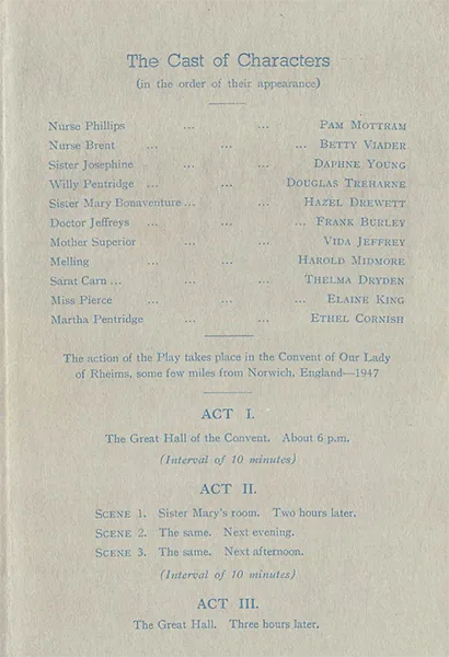 The action of the play takes place in a convent and the realistic set heightened the effect. It was painted by Richard Drewett. Stage manager was Theodore Kendrick, with Nicol Rowan as prompt. Jack Drewett and Norman Rowe were general and business managers and chief steward was Leslie Young. Megan Leleu arranged the refreshments.