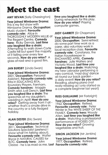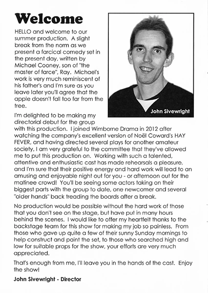 The production marks the directorial debut at Wimborne of John Sivewright, who uses the stage well and keeps up the furious pace that is the first requirement of farce. One practical point: if the time of day is referred to in the programme and in the script, it’s a good idea for the clock which is part of the set to agree with it.