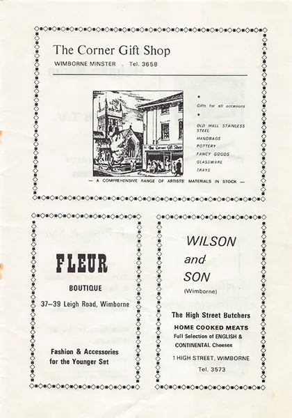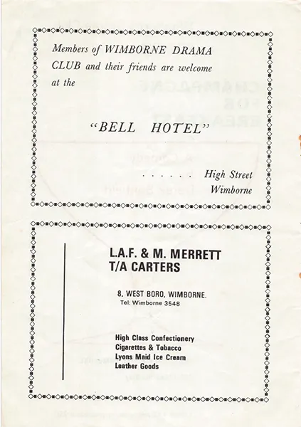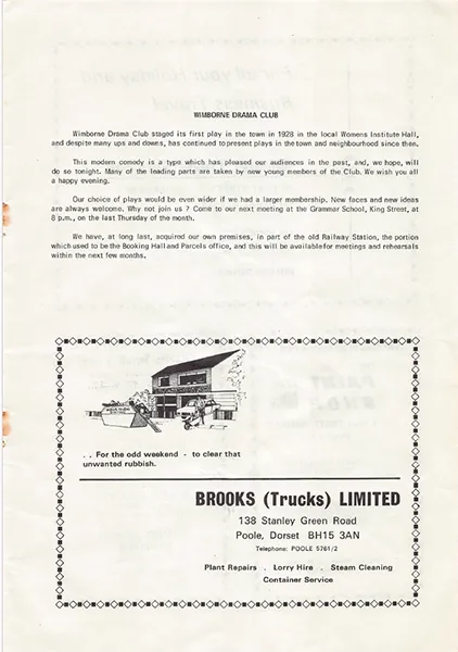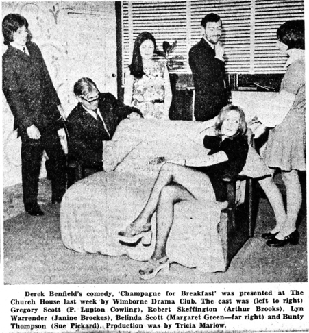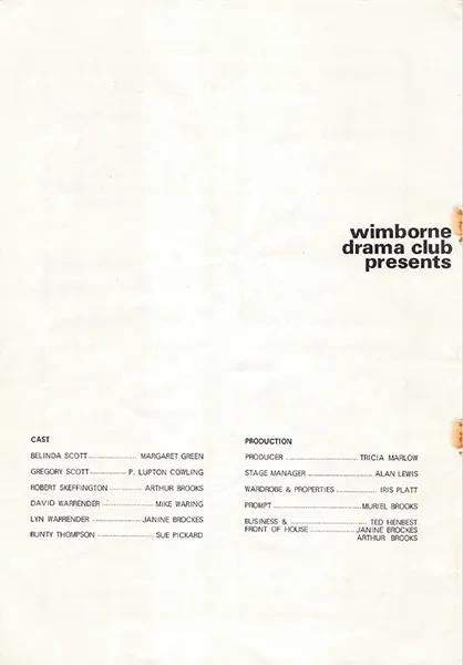 1972 Alan Lewis Church House Comedy Edmund Henbest Iris Platt Janine Brockes Joe (Arthur) Brooks Margaret Green Michael Waring Muriel Brooks Past Productions Peter Lupton Cowling Sue Pickard Tricia Marlow Wimborne Drama Club