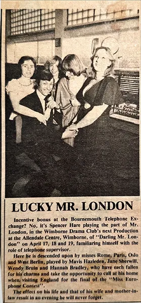 Incentive bonus at the Bournemouth Telepphone Exchange? No it’s Spencer Hare playing the part of Mr. London, in Wimborne Drama Club’s next production at the Allendale Center, Wimborne of “Darling Mr London” on April 17, 18 and 19, familiaring nimself with the role of telephone supervisor.