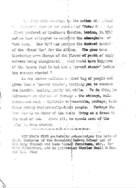 Excellently produced by Mr L. H. Mottram, Wimborne Drama Club’s presentation of J. M. Barrie’s Dear Brutus drew big audiences to Wimborne County Modern School. Himself giving a first-rate characterisation as the ageless Lob, the producer set a pace that was well sustained throughout the performances, and helped to create the atmosphere of fantasy so necessary to this story of a group of disillusioned people who receive a second chance through a visit to a mysterious wood on Midsummer Eve.