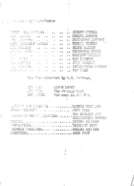 Barrie Nott and John Poat stage-managed and were also responsible for settings, decor and lighting, which, especially in the wood scene, helped immensely in creating the essential atmosphere. They were assisted by Ian Raeburn and Christoper Ridout. Brenda Sammons prompted and acted as wardrobe mistress and Rosemary Poat looked after properties.