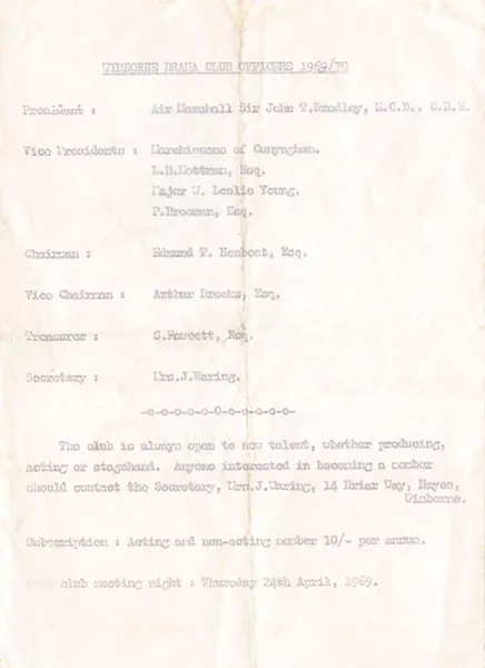 Setting, decor and lighting – including the very effective wood scene – were contrived by Barrie Nott and John Poat, who stage managed, assited by Ian Raeburn and Chrisopher Ridout. Brenda Sammons prompted and was responsible for the very effective costumes; and Rosemary Poat was properties mistress.