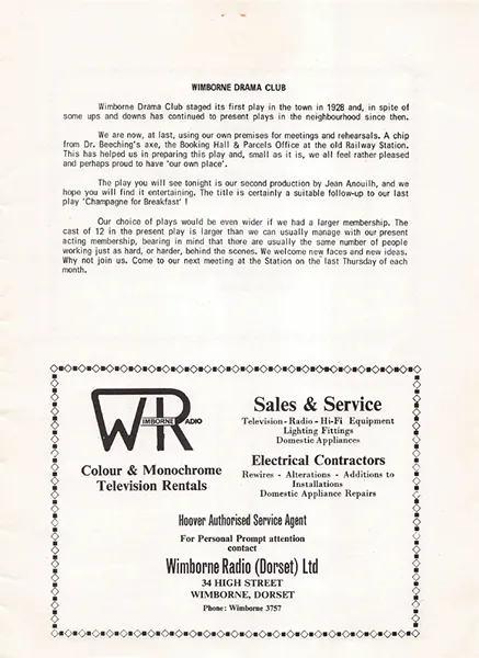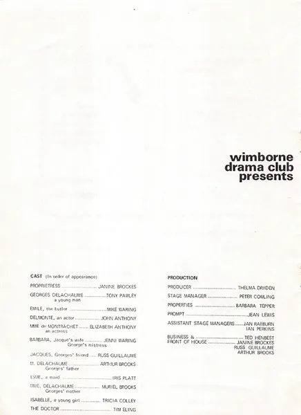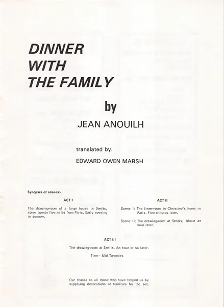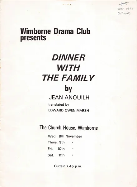 Such, in brief, is the plot of Jean Anouilh’s comedy ‘Dinner with the family,’ which Wimborne Drama Club staged at Church House last week – the title referring to a phony dinner party planned by the ‘hero,’ Georges Delachaume. And skilful production by Thelma Dryden ensured that full advantage was taken of every opportutity for laughs and for sentimental touches.