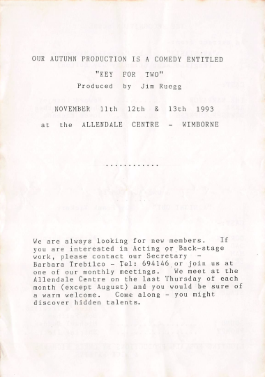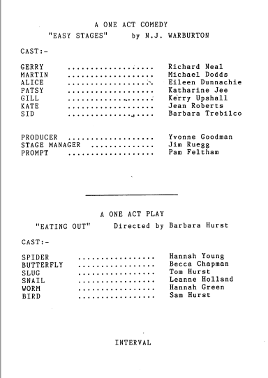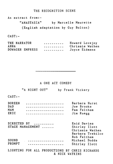 This is an amusing, subtle parody of the backstage goings-on of an amateur dramatic society. While N.J. Warburton’s play Don’t Blame It On the Boots centred on the onstage difficulties of the amateur dramatic society’s production of Hamlet, here we see the stage crew struggling to play their part against all the odds.