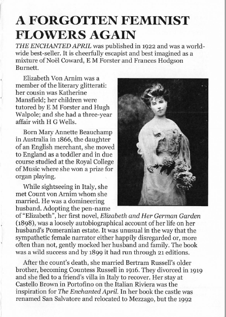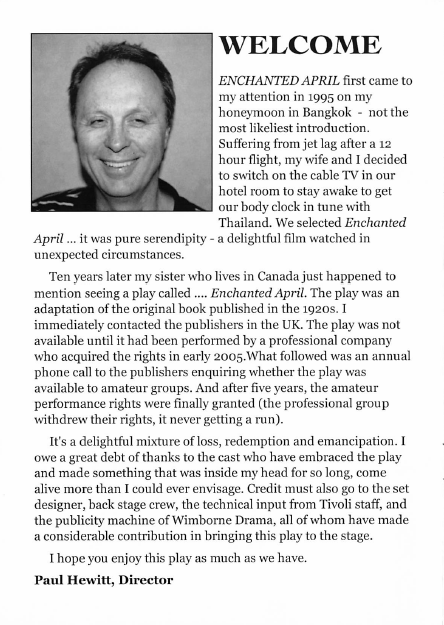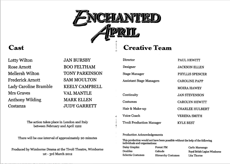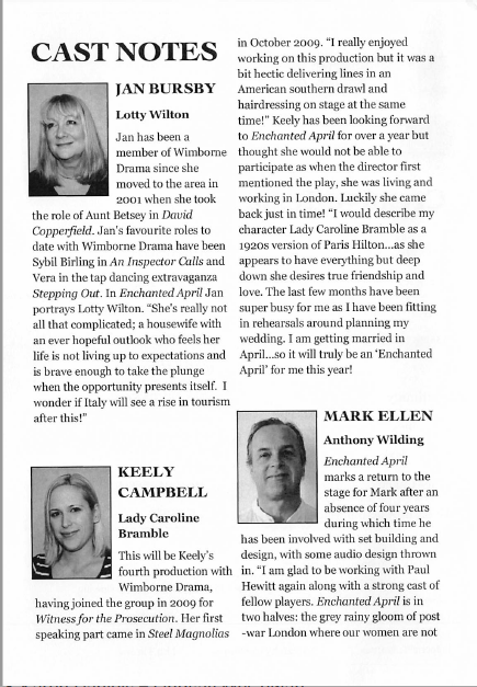 The two husbands, Mellersh Wilton and Frederick Arnott, played by Tony Parkinson and Sam Moulton, together with Mark Ellen as Anthony Wilding, the owner of the castle, embraced their roles in style, all of which made for an entertaining and heart-warming evening.Adapted from a best-seller published in 1922, Enchanted April was a good choice of play, skilfully executed.