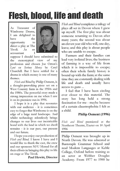 This hidden but dramatic change in England’s rural landscape is the background to Philip Osment’s powerful play, Flesh and Blood, which was the daring choice for Paul Hewitt making his debut as a director with the talented Wimborne Drama group.