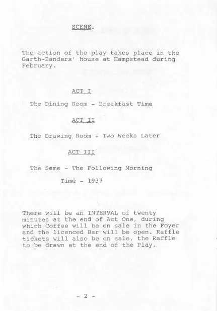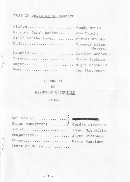 Spencer Madan-Mayers, Nigel Woodward and Jan Stevenson completed the line-up. The play was capably produced by Raymonde Grenville and the set by Gordon Eidmans captured the atmosphere of the place and the period = Hampstead before the war.