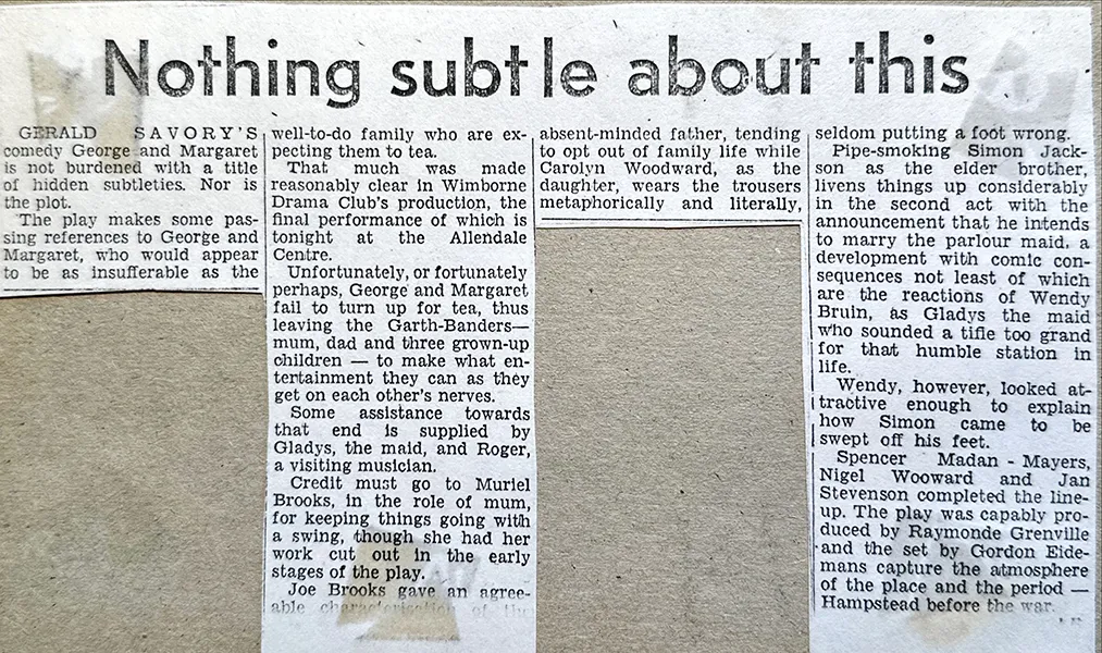 Gerald Savory’s comedy George and Margaret is not burdened with a title of hidden subtleties. Nor is the plot. The play makes some passing references to George and Margaret, who would appear to be as insufferable as the well-to-do family who are expecting them to tea. That much was made reasonable clear in Wimborne Drama Club’s production, the final performance of which is tonight at the AAllendale Centre.