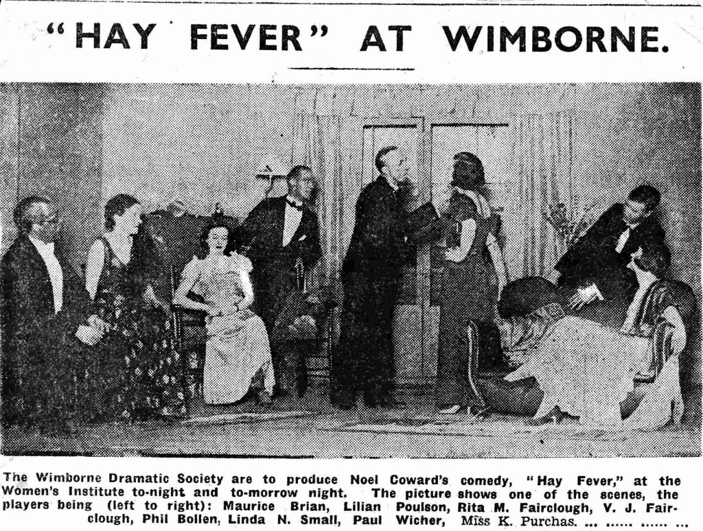 The staging of Hay Fever, Noel Coward’s successful play at Wimborne on Monday and Tuesday evenings by the Wimborne Dramatic Society, under the direction of Mr. L. H. Mottram, resulted in a fine presentation. The acting throughout preserved the exceptionally high standard which is now looked for from the members of the society.