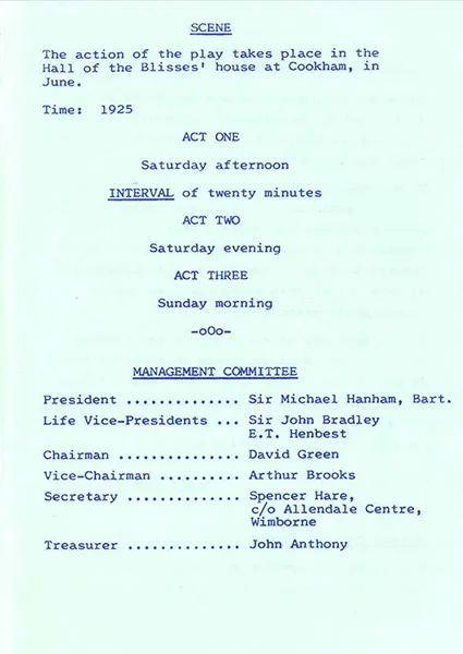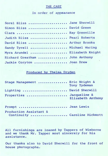 Once again the production was in the ever-capable hands of Thelma Dryden, the driving force behind the club. Eric Wright and Tony Tydeman looked after the stage management while David Sherwill was in charge of the lighting and front of house photographs.Properties were by Jacqueline and Elizabeth Anthony with Jane Lewis as prompt and Caroline Hickmott as production assistant.