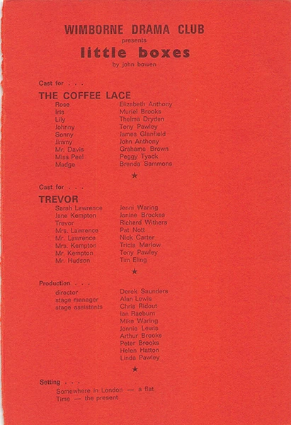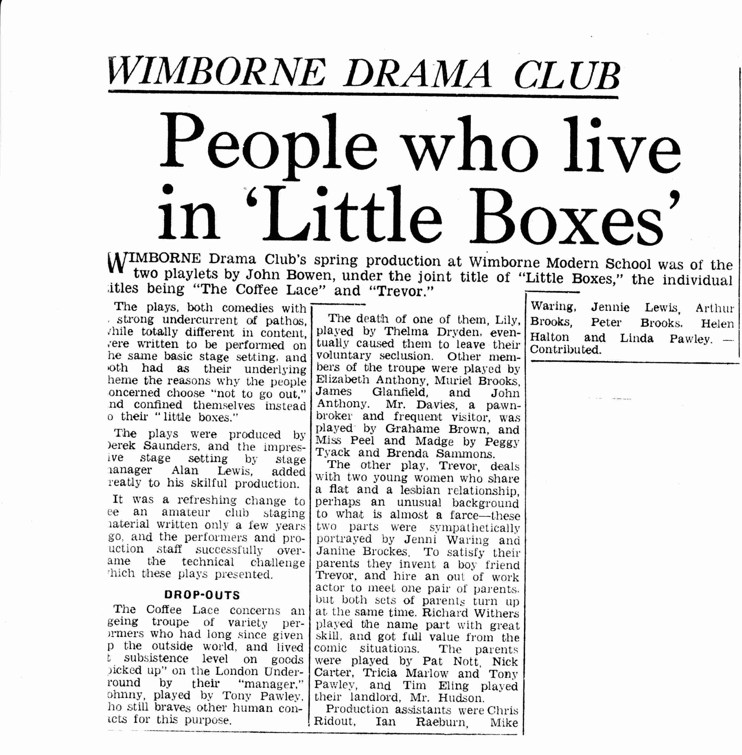 Wimborne Drama Club’s spring production at Wimborne Modern school was of the two playlets by John Bowen, under the joint title of Little Boxes, the individual titles being The Coffee Lace and Trevor.
