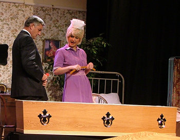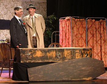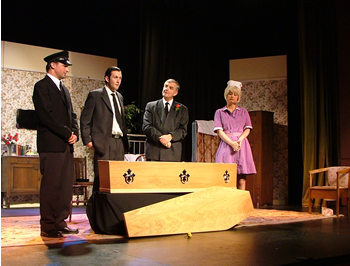 The play centers around two amateur thieves (and suggested lovers), Dennis and Hal. Dennis works as a hearse driver for an undertaker and the pair have robbed the bank next door to the funeral parlor. They decide to hide their ‘loot’ in the coffin of Hal’s recently deceased mother, stashing her body in a wardrobe in the meantime. However, before they can remove the coffin, the dead body is discovered by Fay McMahon , a predatory nurse who makes a habit out of marrying men who subsequently die in strange circumstances. She has now quickly engaged herself to marry Hal’s father but when she discovers the Hal and Dennis’ stash of cash, she demands a third of the spoils. Dennis and Hal’s tricky situation is worsened further by the arrival of Inspector Truscott, who strangely disguises himself as a man from the local Water Board. Using the conventions of standard farce, the trio attempt to keep the body and the money away from the Inspector in an increasingly tangled web of deceit and corruption.