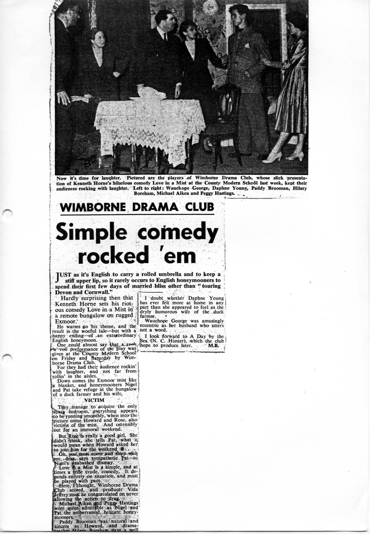 Wimborne Drama Club scored a notable “hat-trick” last week when, in presenting Kenneth Horne’s popular comedy, “Lovein a Mist”, at Wimborne County Modern School, they introduced three new amateurs to the public.