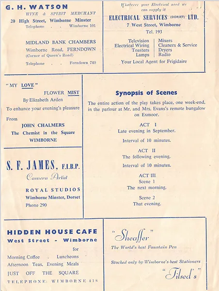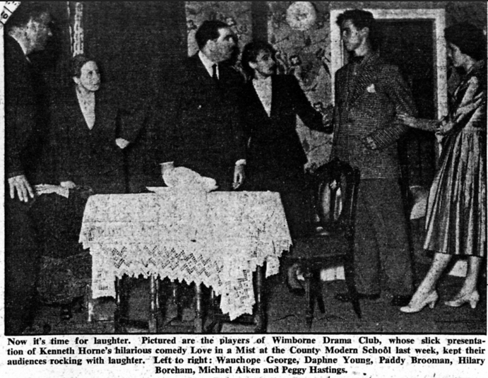 Two of them – Michael Aiken, a Wimborne Grammar School boy, and Peggy Hastings, a receptionist, are playing the “newly-weds”, Nigel and Pat; and the third, Hilary Boneham, a teacher at Wimborne County