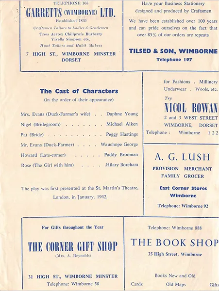 The cast was: Mrs Evans (the duck-farmer’s wife), Daphne Young; Nigel (bridegroom), Michael Aiken; Pat (bride), Peggy Hastings; Mr Evans (duck-farmer) Wauchope George; Howard (latecomer), Paddy Brooman; Rose (the girl with him), Hilary Boreham.