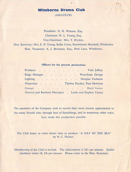 Officers connected with this production were: Vida Jeffrey (Producer), Wauchope George (Stage Manager), Douglas Treharne (Lighting), Thelma Dryden and Pam Mottram (Properties), Beryl Verran (Prompter) and Leslie and Daphne