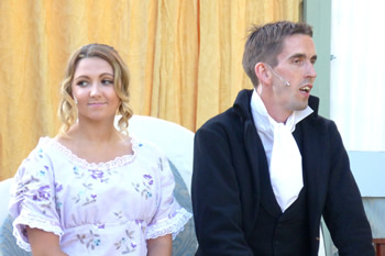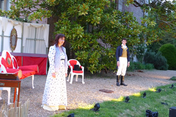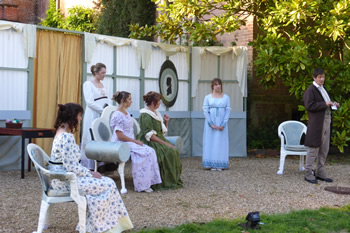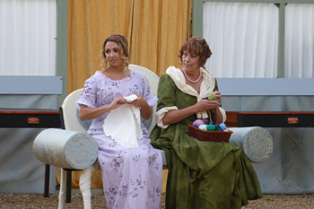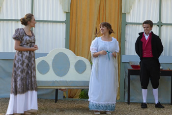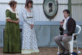 Sam Moulton’s production coped well with the special challenges of open-air drama. It was particularly noticeable how Elizabeth usually sat slightly apart, perhaps distancing herself from the antics of her sisters. The clever set was quite easily adaptable from the genteel impecuniousness of the Bennet household to the seriously grand country seat of Lady Catherine de Bourgh.
