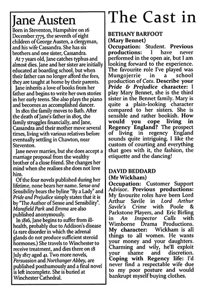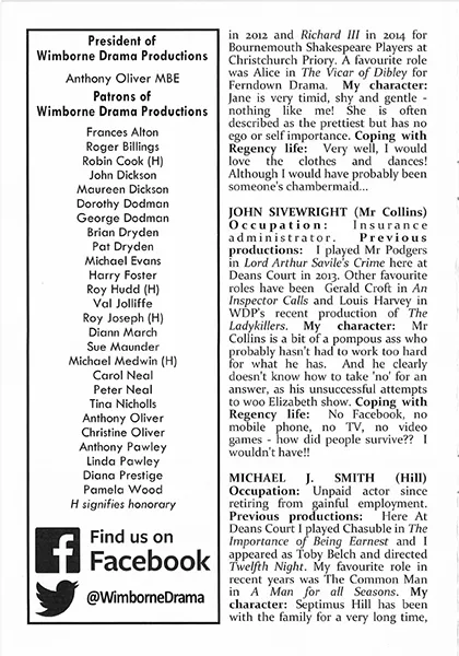 It was good to see Gary Paine back on the am-dram scene. Formerly a leading light with the Broadstone Players, he added just the right measure of humour as the put upon Mr Bennet. Tracey Nicholls was perfect as the strong minded and intelligent Elizabeth, fighting her attraction to Mr Darcy, played with the utmost cool by Rob Cording.