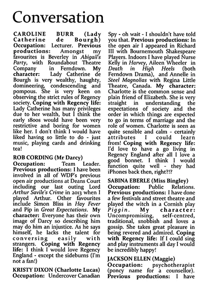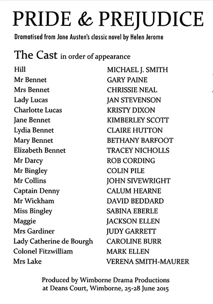 However this is above all an ensemble piece and among the supporting cast, Kimberley Scott as Jane Bennet, sick for love of Mr Bingley, Sabina Eberle as the odious Miss Bingley and Kristy Dixon as Charlotte Collins, née Lucas, stood out. Cameos deserving a mention came from Michael J Smith and Mark Ellen as Hill the butler and Colonel Fitzwilliam respectively.