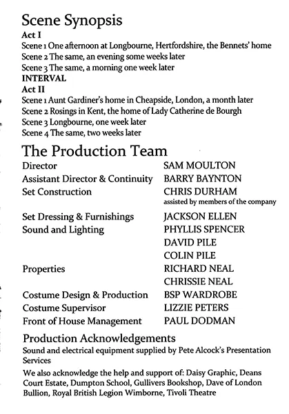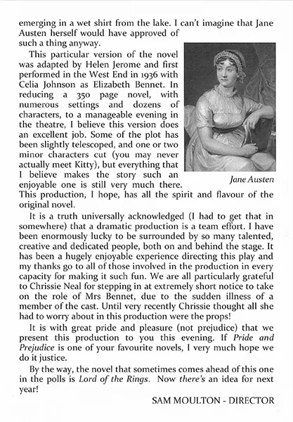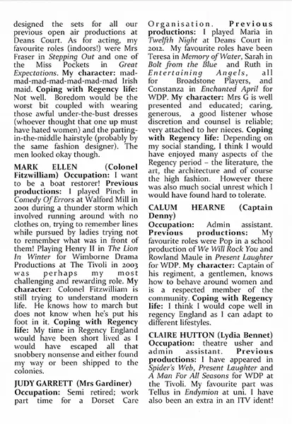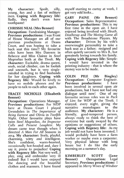 With 20 characters, it is impossible to mention everyone, although with no weak links, they all deserve accolades. You would never have guessed that Chrissie Neal had stepped into the pivotal role of Mrs Bennet at extremely short notice as her word perfect performance was more that of someone who had rehearsed for months. She simply became that snobby mother with her eyes on wealthy neighbours as matches for her girls.