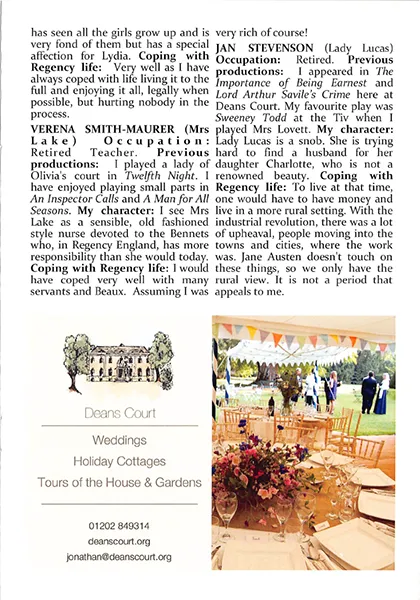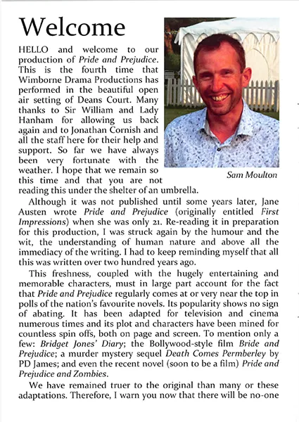 It is a truth universally acknowledged that Wimborne Drama rarely put on a poor production, and ‘Pride and Prejudice’ keeps up their high standard. It demands a large cast but there is barely a weak link, and it is staged in the gardens of Deans Court, the fourth time that Wimborne Drama have made use of those very special surroundings for their annual open-air drama.