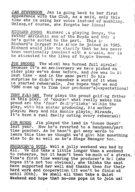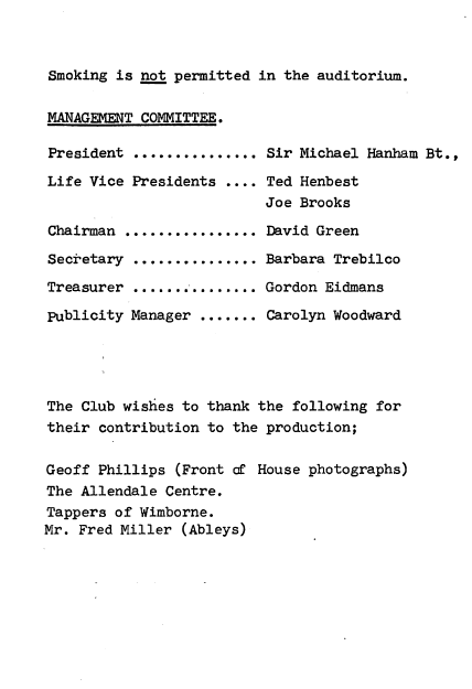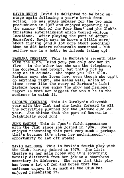 Others cast included Jim Ruegg as poacher Sam Pecker, Shirley Ilott as Miranda and June Easden and Tony Feltham as the argumentative couple Marcia nd Jim Brent.