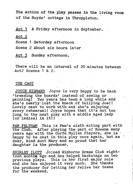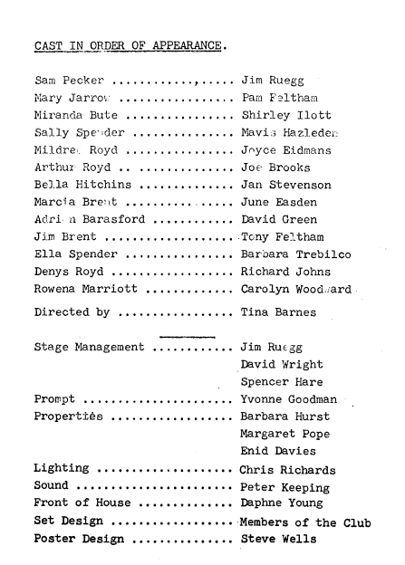 Drama club veteran Joe Brooks took on the same role as when they first prresented the play, 15 years ago and put considerable character into the part of father of the household Arthur Royd. Joyce Eidmans mad a comeback to the boards after two years to be the motherly Mildred his wife and Richard Johns took on his biggest part yet as the Royd’s sarcastic son Denys.