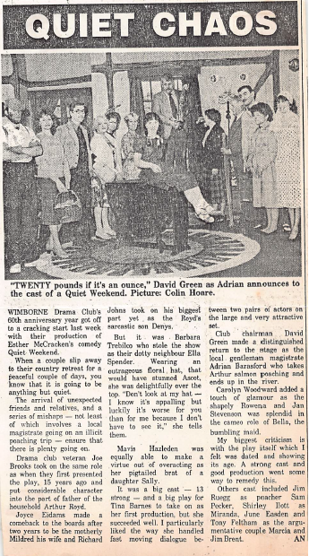 Club chairman David Green made a distinguished return to the stage as the local gentleman magistrate Adrian Barasfordwho takes Arthur salmon fishing and ends up in the river. carolyn Woodward added a touch of glamour as the shapely Rowena and Jan Stevenson was splendid in the cameo role of Bella, the bumbling maid.