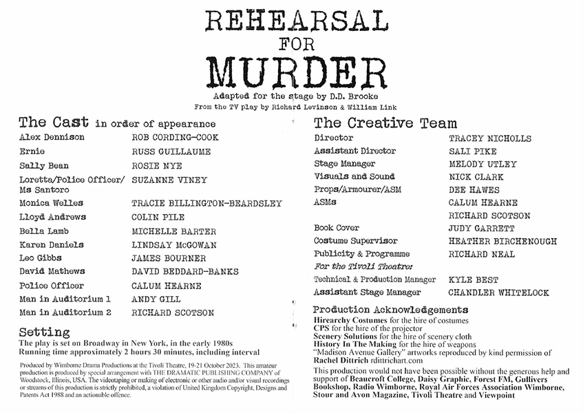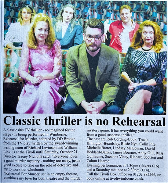 A classic 80s thriller – re-imagined for the stage – is being performed in Wimborne. Rehearsal for Murder, adapted by D. D. Brooke from the TV play written by ward-winning writing team of Richard Levinson and William Link, is at the Tivoli until Sturday, October 21.