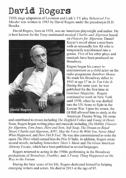 Rehearsal for Murder is a classic thriller, adapted for the stage by D.D. Brooke from the TV play written by the legendary award-winning writing team of Richard Levinson and William Link, whose work includes Murder, She Wrote and Columbo.
