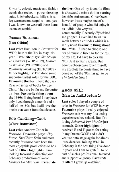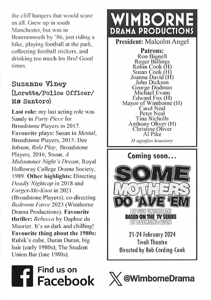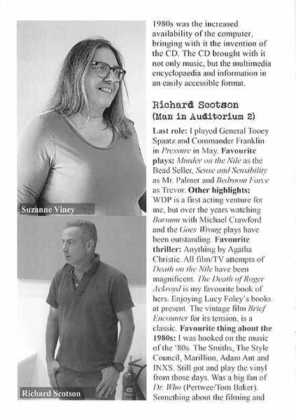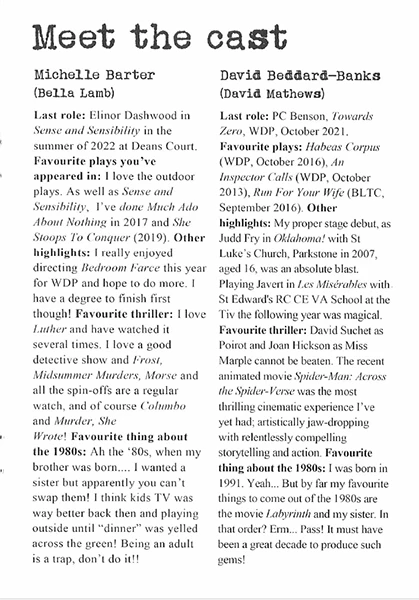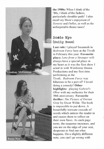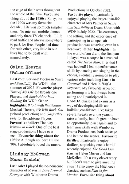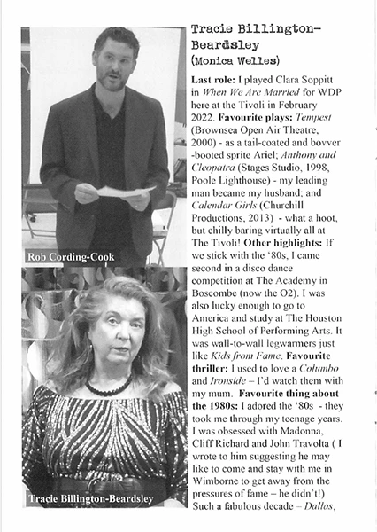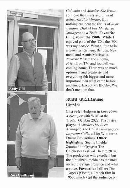 2023 Andy Gill Calum Hearne Chandler Whitelock Colin Pile David Beddard-Banks Dee Hawes Heather Birchenough James Bourner Judy Garrett Kyle Best Lindsay McGowan Melody Utley Michelle Barter Nick Clark Past Productions Richard Neal Richard Scotson Rob Cording-Cook Rosie Nye Russ (Alan) Guillaume Sali Pike Suzanne Viney Thriller Tivoli Theatre Tracey Nicholls Tracie Billington-Beardsley Wimborne Drama Productions