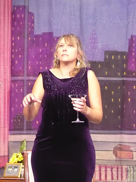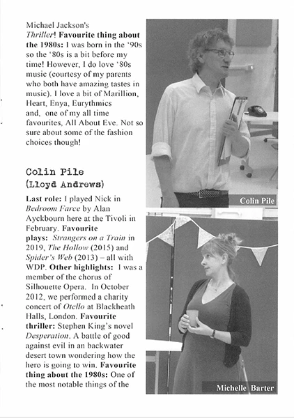 The sets were as ever very good, always a strong point for the group and I liked the backdrops and the use of the projector. The ghostly figure of Monica was overplayed and ultimately detracted from some of those scenes. The programme was as good and interesting as I have come to expect from Wimborne Drama, though I am sure a picture noted as Robert Preston was in fact of Patrick Macnee!