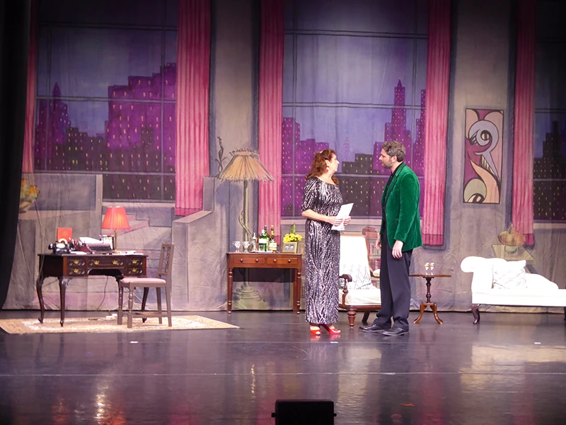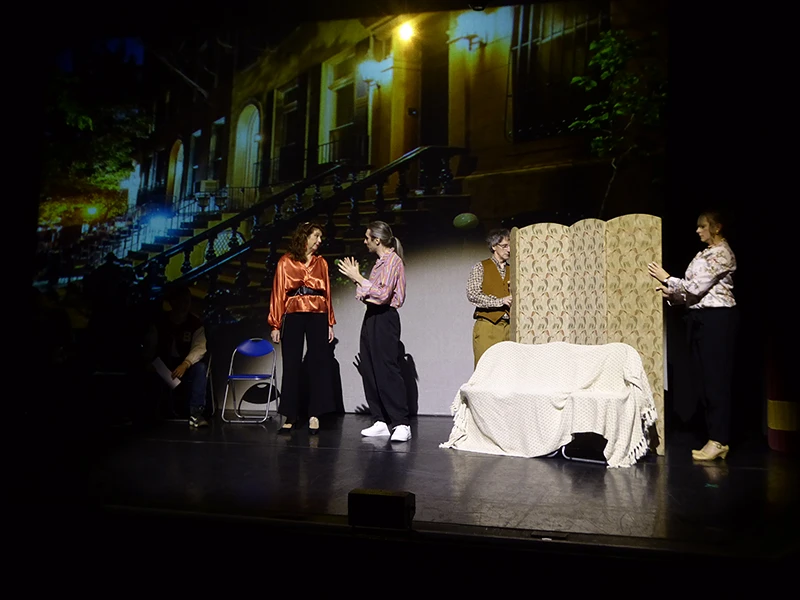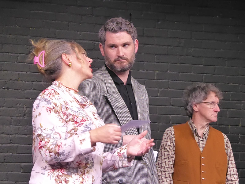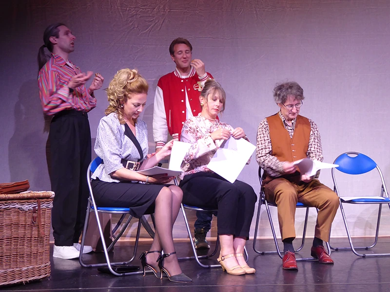 Supporting the two protagonists are the participants in Alex’s play with feisty performances from Michelle Barter as producer Bella, and Lindsay McGowan as actress Karen. The three male actors Lloyd (Colin Pile), Leo (James Bourner) and David (David Beddard-Banks) are also convincing as they try to work out the playwright’s intentions. Rosie Nye is delightfully enthusiastic as Alex’s secretary Sally.