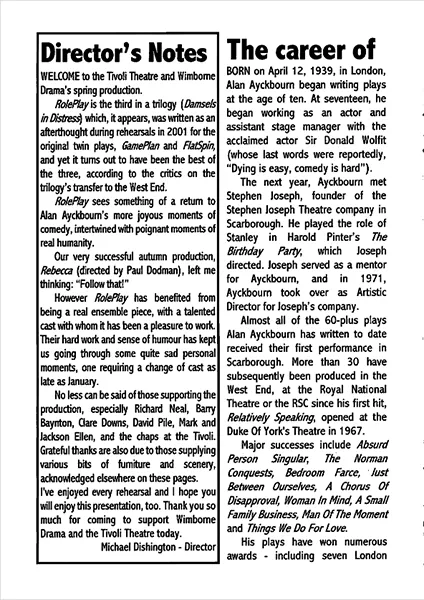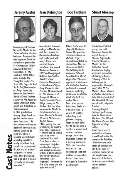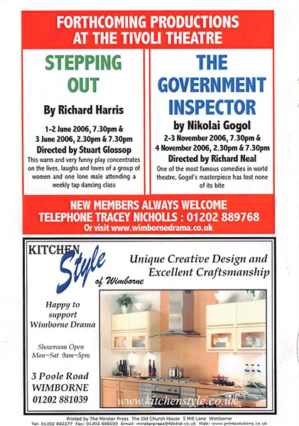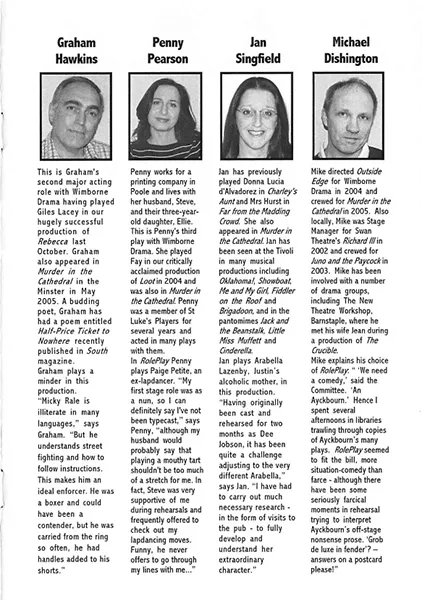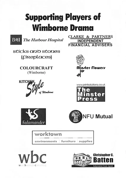 2006 Ashley Thorne Barry Baynton Boo Feltham (Dickson) Carolyn Hewitt (Woodward)(Young) Clare Downs Comedy Dave Williams David Pile Don Sherry Graham Hawkins Jackson Ellen (Kingham) Jan Singfield Jean Dishington Jeremy Austin Mark Ellen Michael Dishington Past Productions Paul Dodman Penny Pearson Penny Whipp (Scotford) Richard Neal Roy Birch Russell Parker Steve Charters Stuart Glossop Tivoli Theatre Wimborne Drama