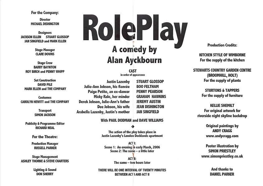 Roleplay is the story of the hopelessly mismatched Justin and Julie-Ann. They are about to introduce their respective parents to each other over dinner – Justin’s upper-crust alcoholic mother from Surrey and Julie-Ann’s bigoted Yorkshire father and prim mother. Into this doomed scenario drops Paige Petite, a former lap-dancer with suicidal tendencies and her gun-toting minder. A high-energy farce from one of Britain’s foremost comedy playwrights.