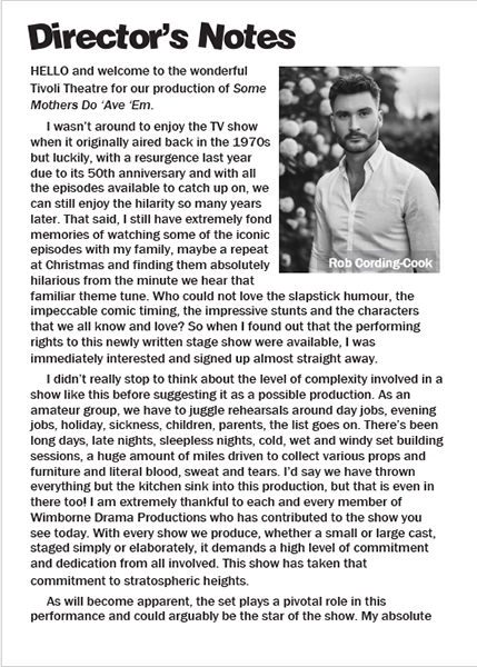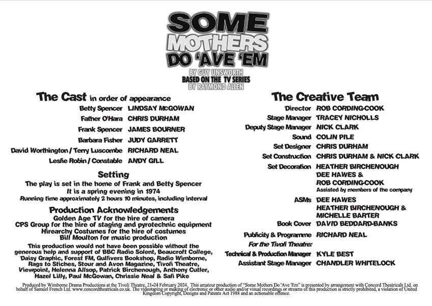 What a hilarious comedy this is. The play is set in 1970’s, and the Golden Age of the British Sitcom on television may have come and gone but with the theatre revival of Some Mothers Do ‘Ave ‘Em, it’s fair to say that the Golden Age is making a comeback on our local stages. Directed by Rob Cording-Cook this production lacks nothing, attention to detail, no gag left unturned with superb timing by the cast.